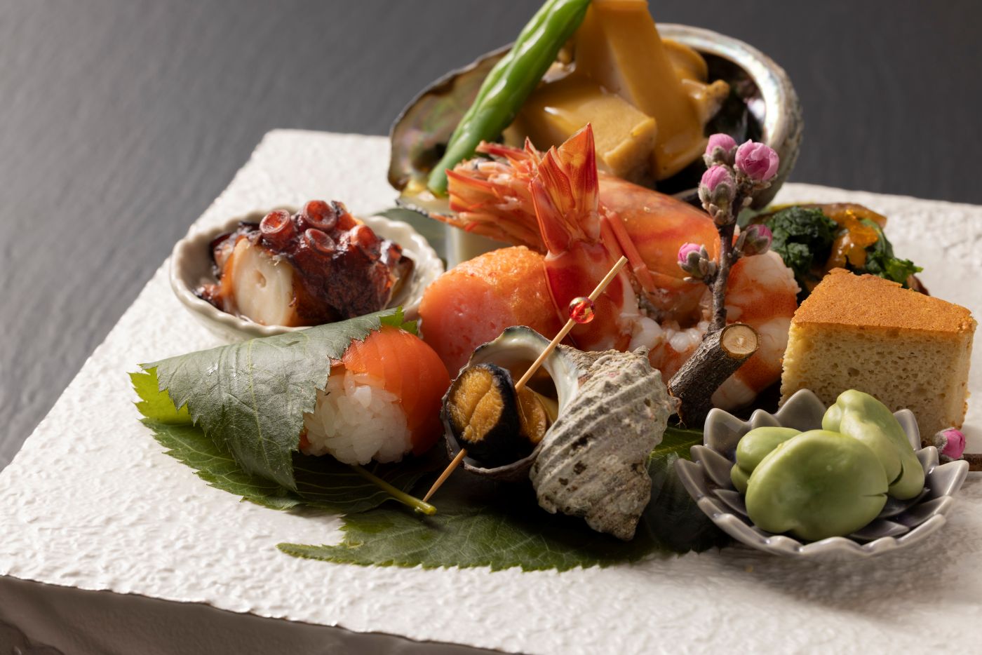 [前 菜] 菜の花のお浸し/蛍烏賊寿司/うすい豆腐/空豆かすてら/桜鱒菜種焼き/筍真薯