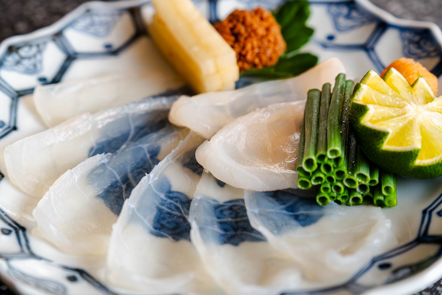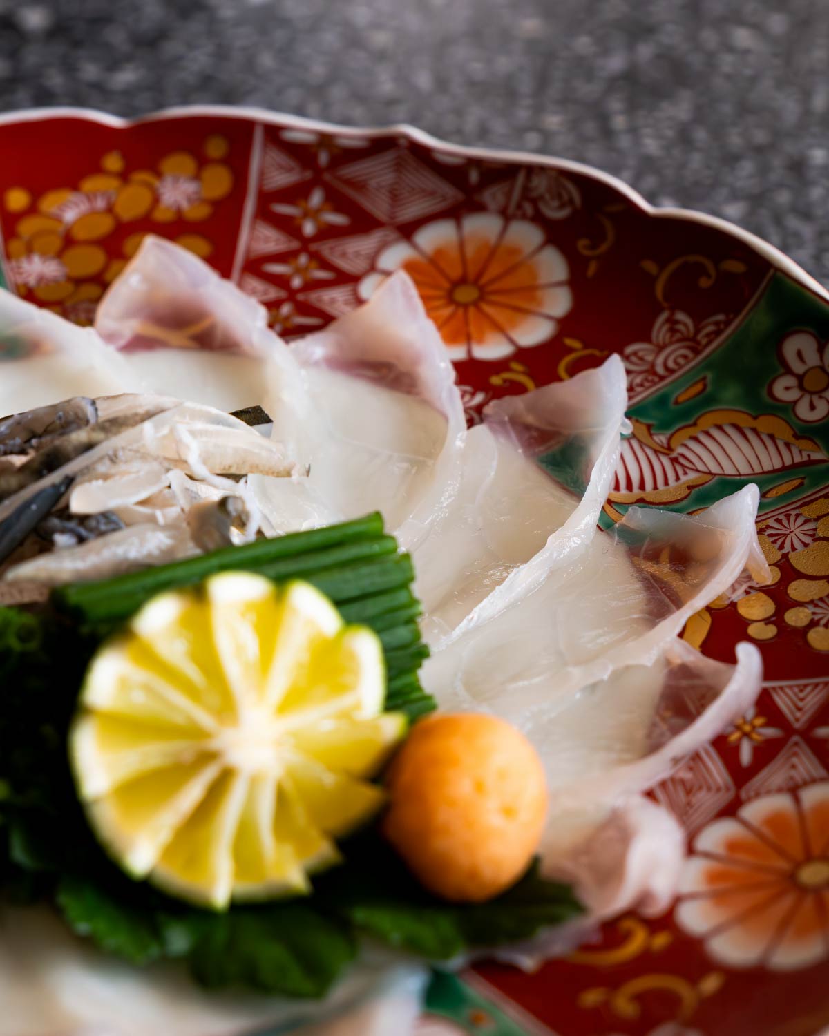 その熟成を最大限に生かして仕立てるのが、美しく薄く引いた伝統の“てっさ”と、熟成ふぐだからこそ実現できる“厚切りてっさ”。薄切りでは繊細な甘みと香りを。厚切りではしっとりした歯切れと凝縮した旨味を。それぞれの表情を楽しみながら食べ比べていただけます。